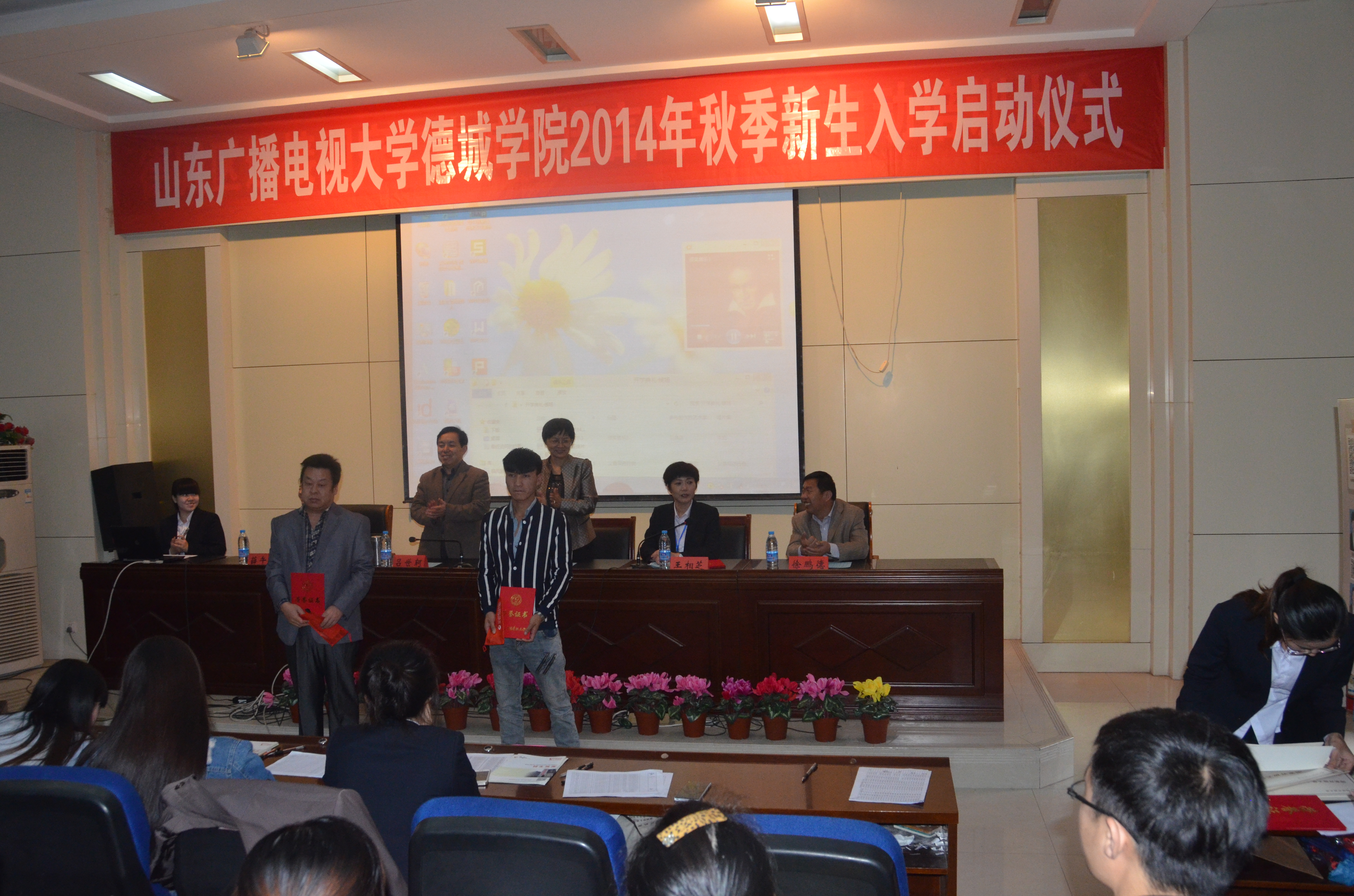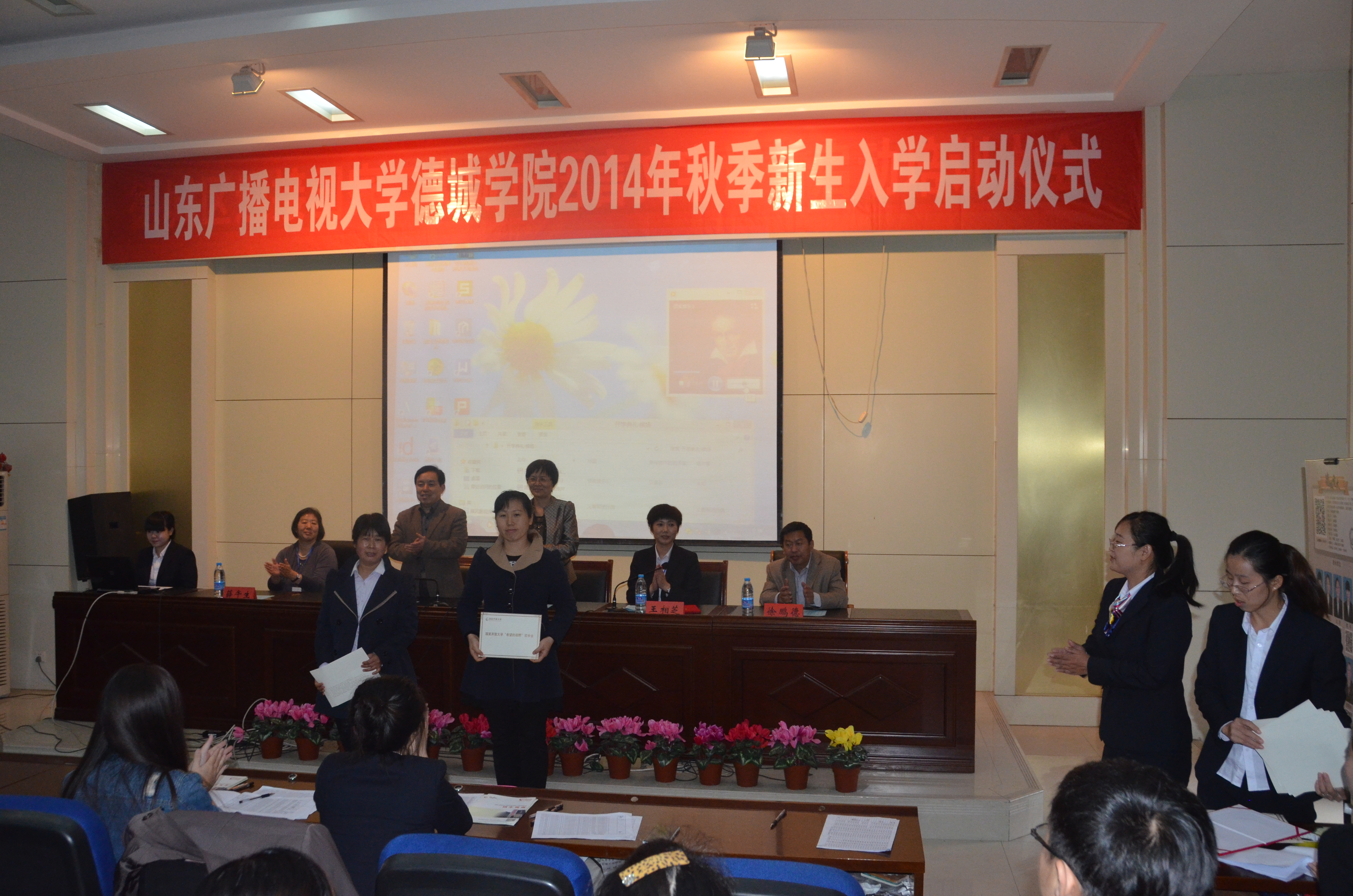 10月19日,山东广播电视大学德城学院2014年秋季学员入学启动暨2013年度奖助学金颁发仪式在德城电大培训中心校区阶梯教室隆重举行。