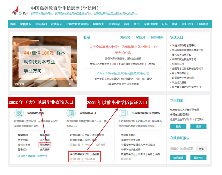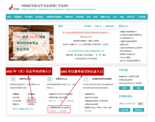 中国高等教育学生信息网(简称“学信网”)地址:https://www.chsi.com.cn/,2002年(含)以后毕业的学历直接查询,不需要认证(特殊情况除外);2001年以前毕业的学历须认证,学历认证步骤: